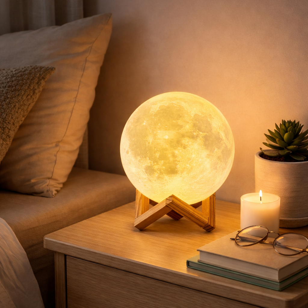 Bring the magic of the moon into your home. This beautifully crafted 3D moon lamp glows with a soft, calming light, creating the perfect cozy atmosphere for any room. Ideal for relaxing nights, stylish decor, or as a unique gift.